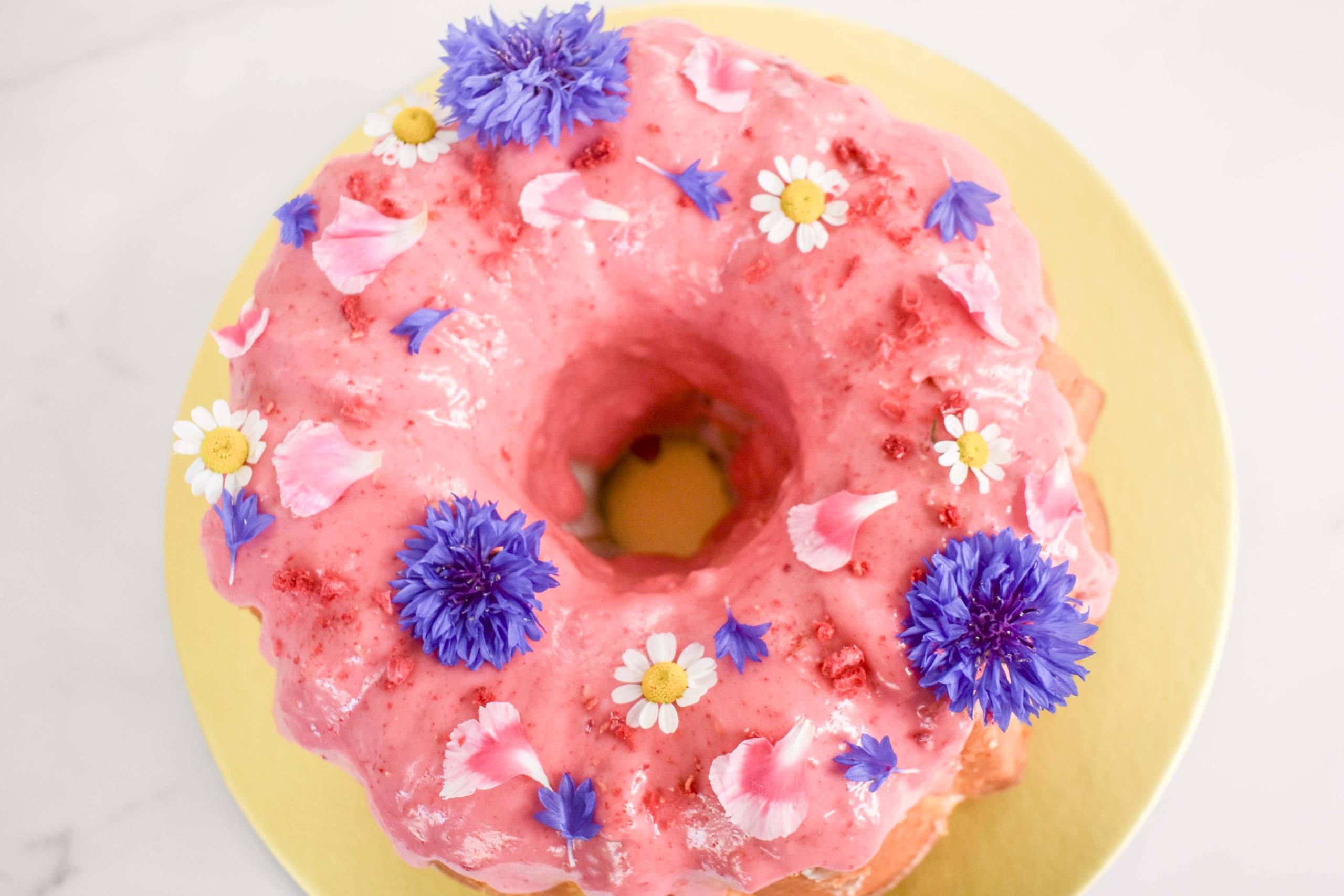 Bright, botanical, and beautifully simple—this vanilla bundt cake is made with simple ingredients, dotted throughout with raspberries, topped with a delicate raspberry rose glaze, and garnished with natural elements like dried and fresh petals.