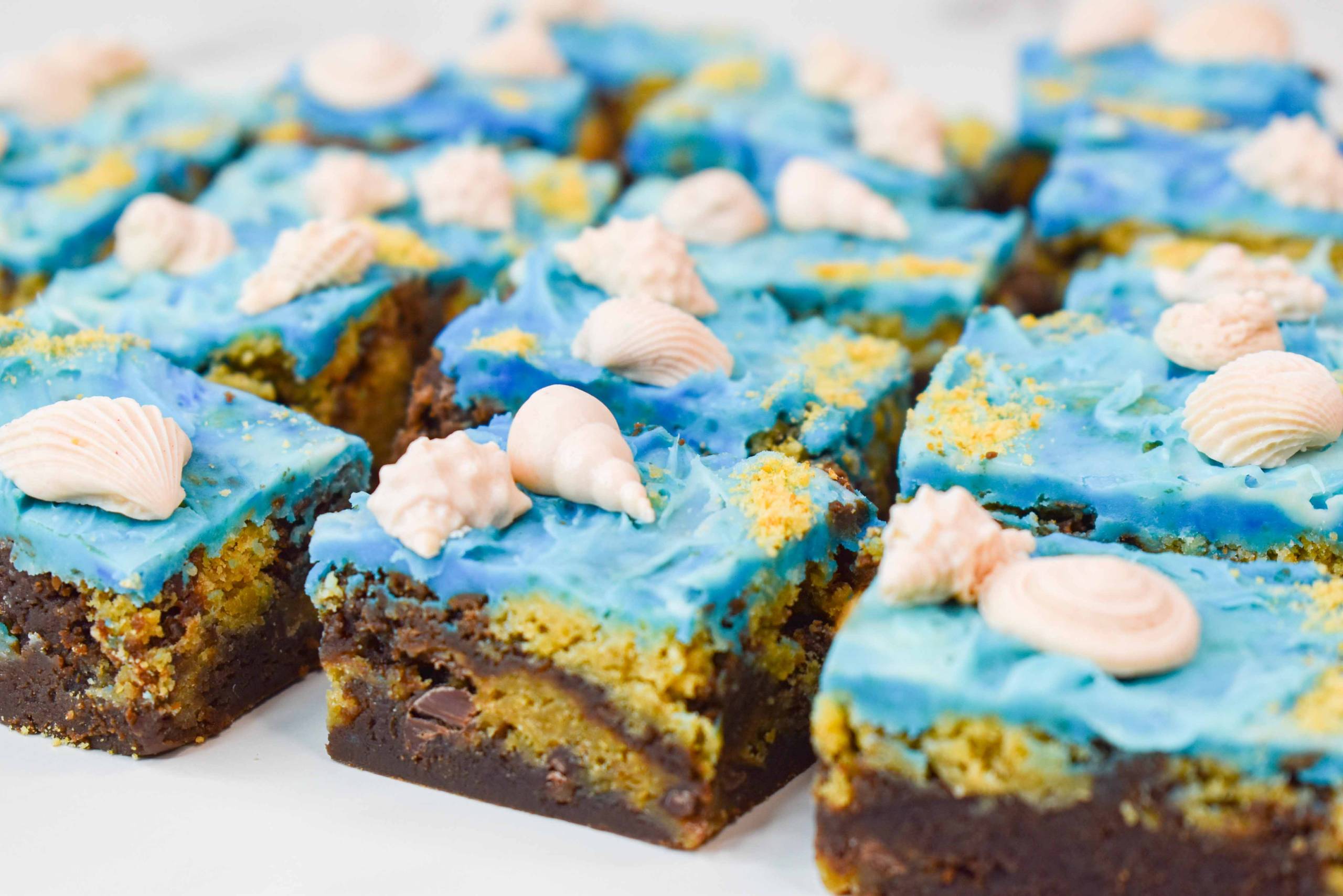 • 🌊 Brookies (brownie-cookie hybrids) with rich ganache and edible beach-inspired art
