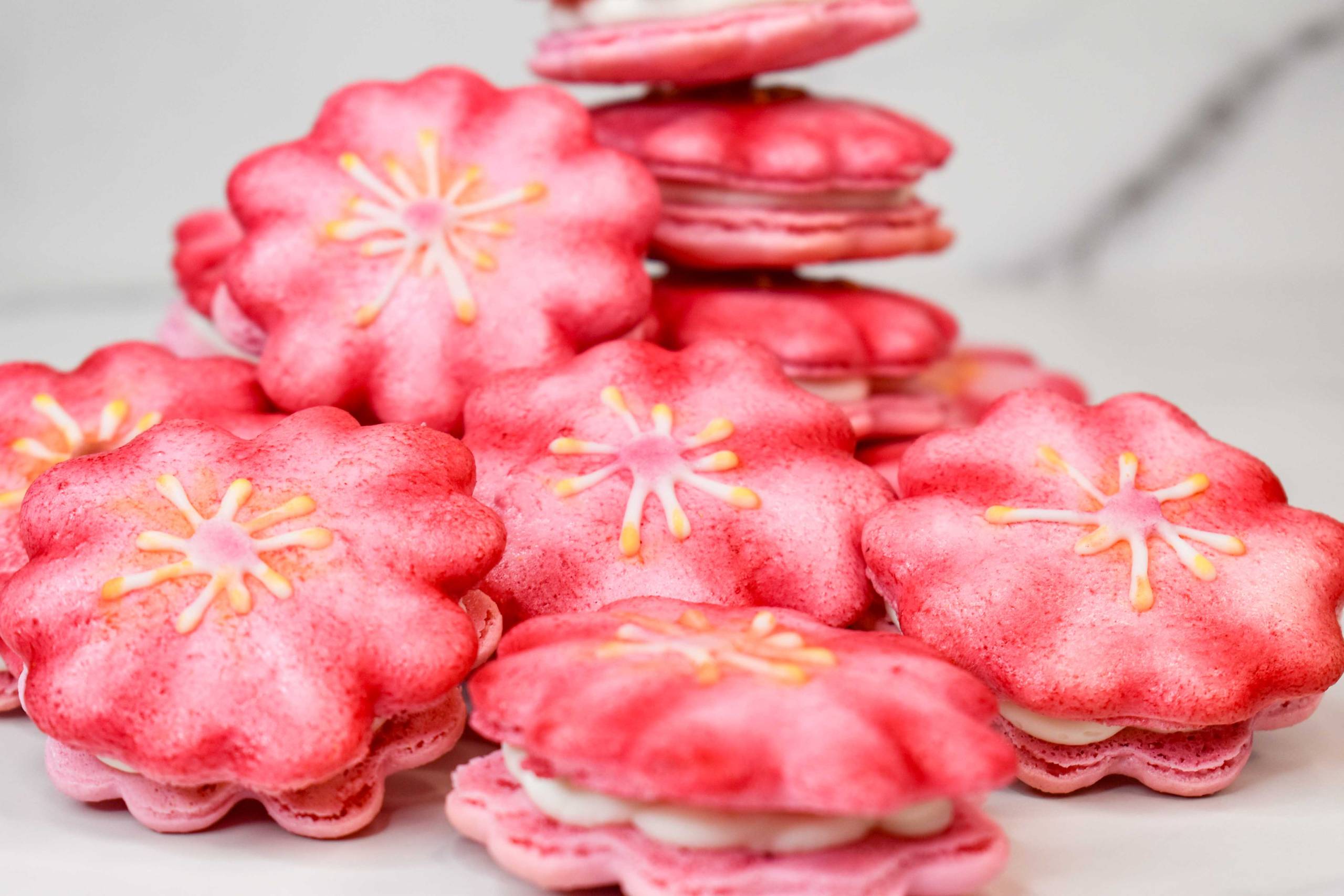 • 🌺 Lychee Macarons decorated with hand-piped cheerful Hawaiian flowers
