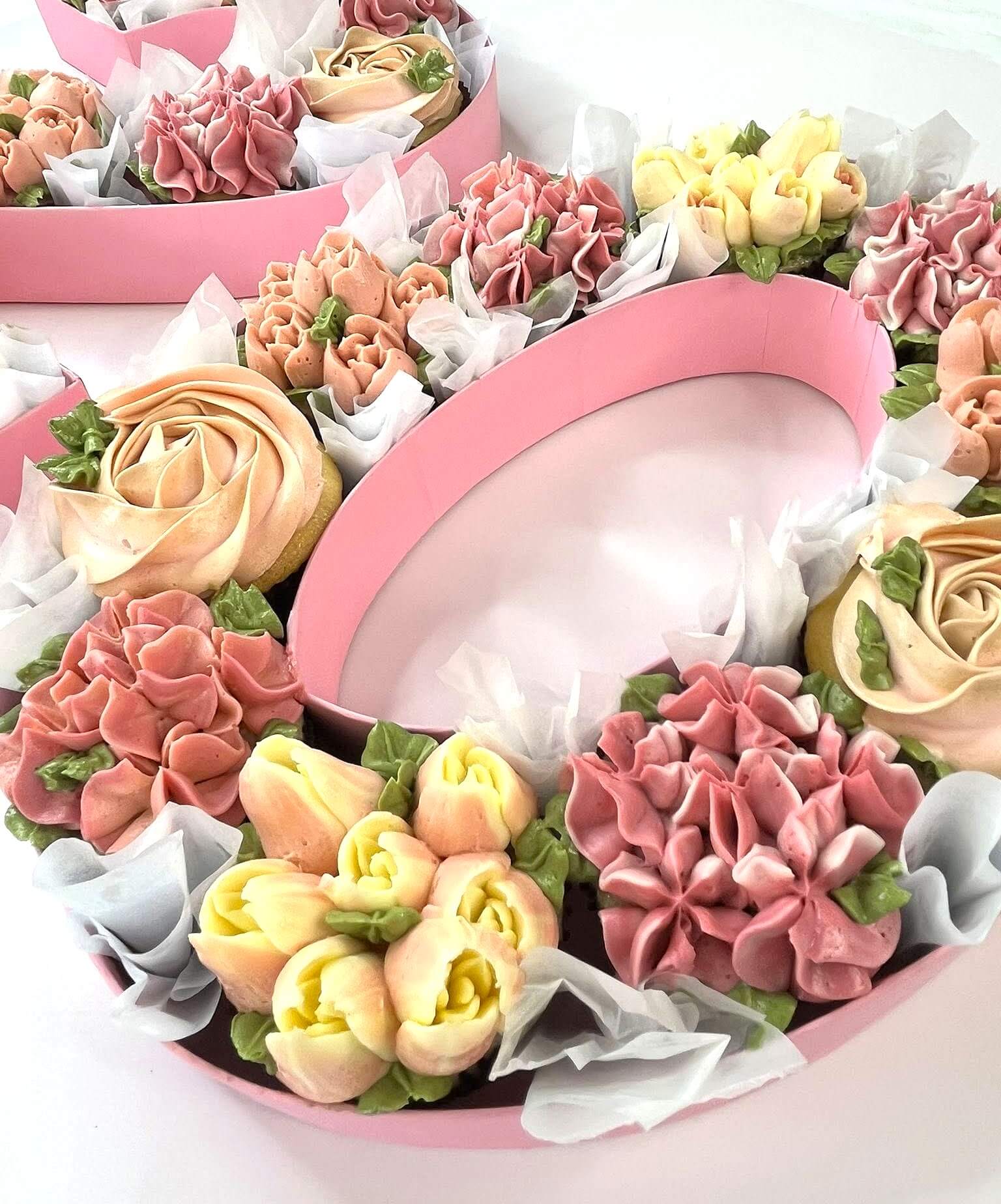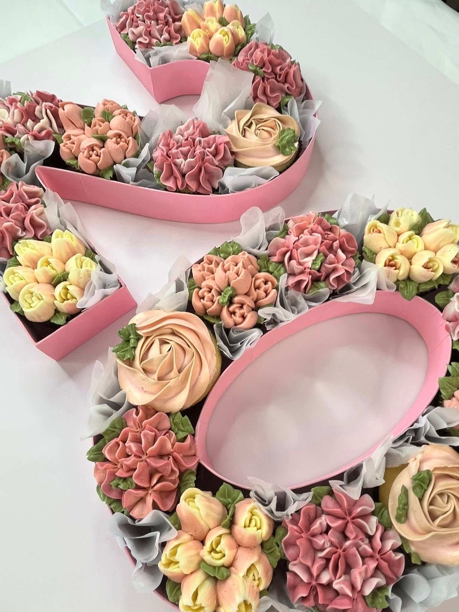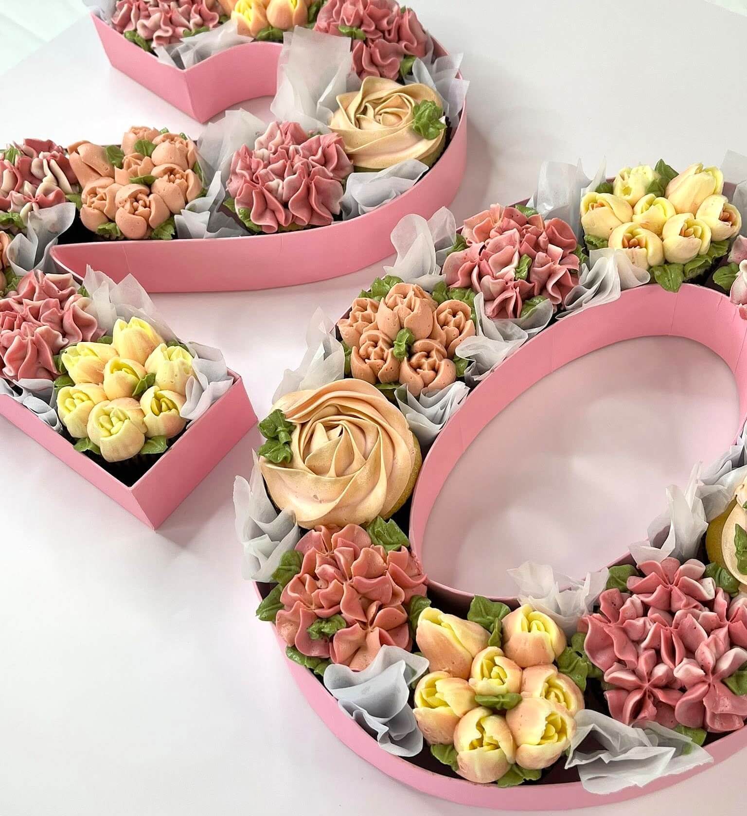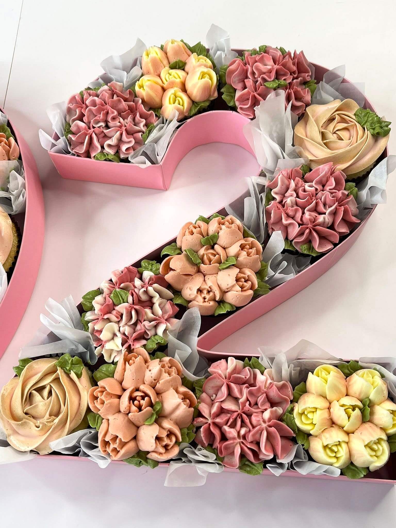 Milestone Blossoms is a celebration reimagined—an arrangement of cupcakes transformed into elegant number shapes, each one crowned with intricate, hand-piped buttercream flowers. Designed to mark life’s most meaningful ages and anniversaries, this cake is both playful and refined, offering the beauty of a floral centerpiece with the joy of individual servings. Every bloom is crafted with care, creating a design that feels timeless, festive, and unforgettable.