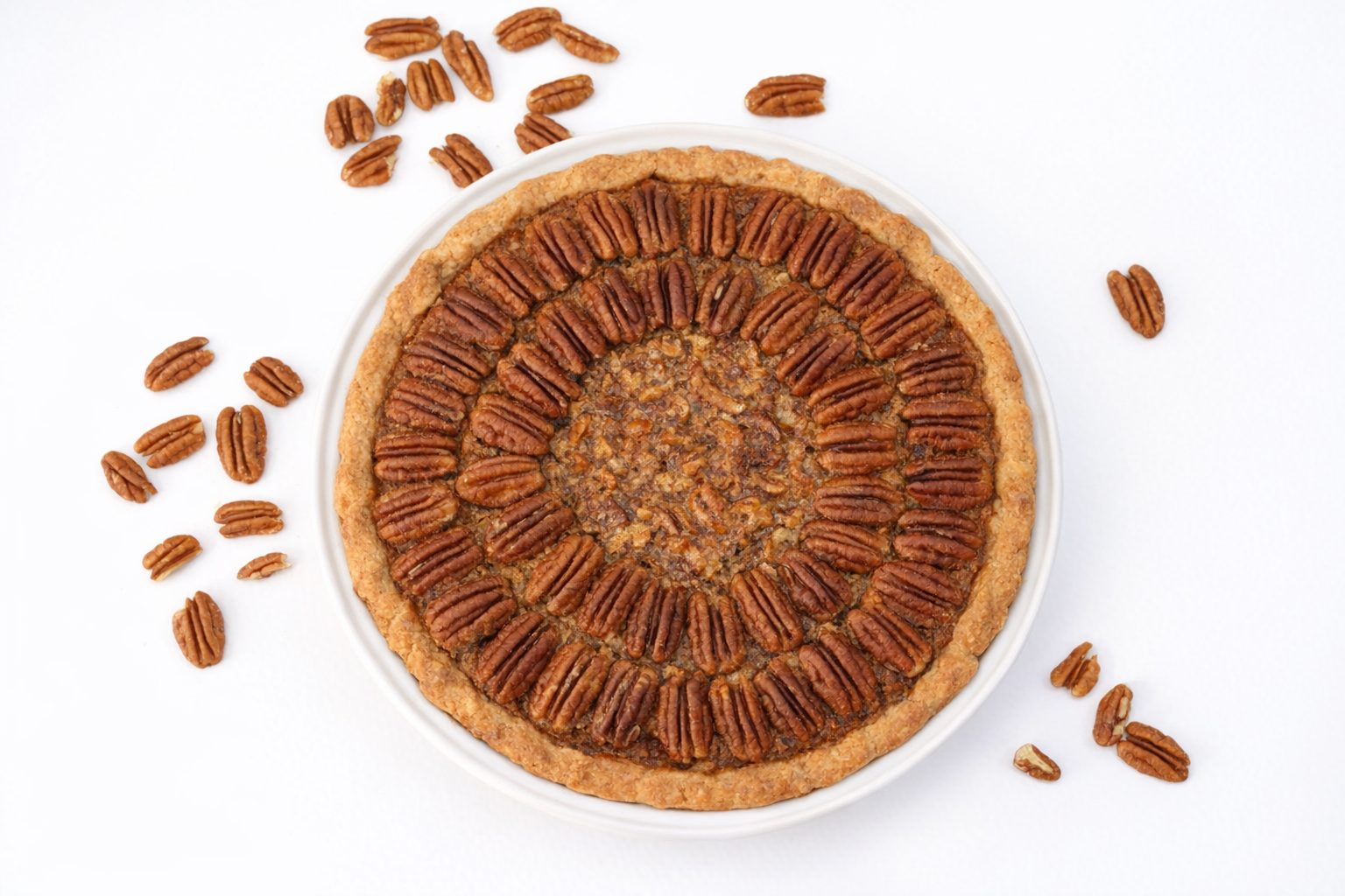 A Southern classic with a spirited twist. This golden, flaky pie is filled with toasted pecans and rich bourbon caramel, baked until glossy and deeply nutty. Topped with whole pecans in rustic rings and served in a ceramic dish for extra charm. Available whole or by the slice.