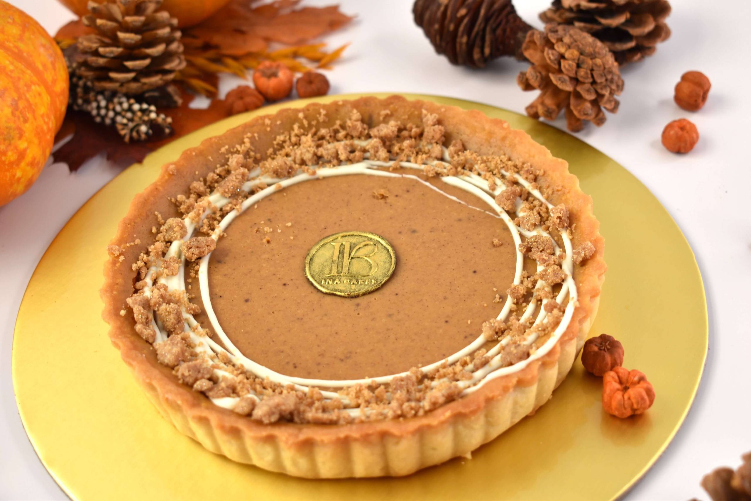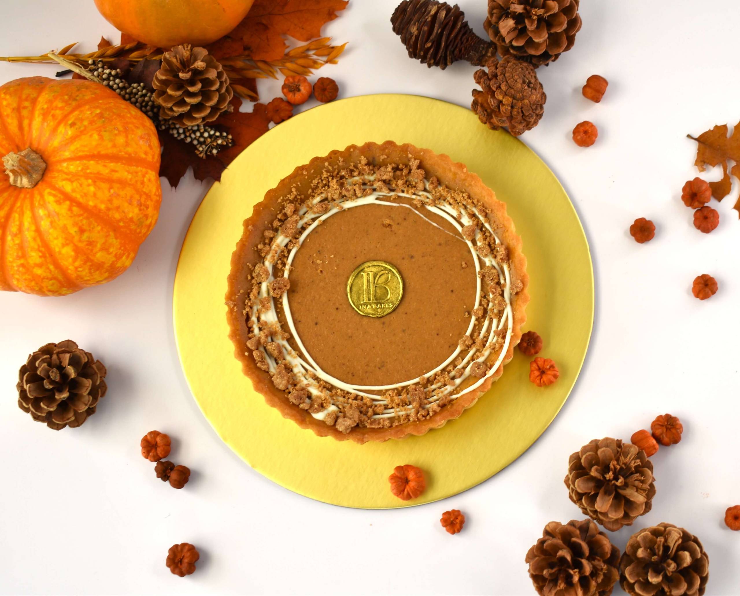Pumpkin Pie Tart (9 ½”) All the cozy traditions of fall in a lighter, modern tart. A creamy pumpkin filling infused with warm spices rests in a delicate crust, finished with a sweet white chocolate drizzle and buttery streusel topping—perfectly sized to serve 8.