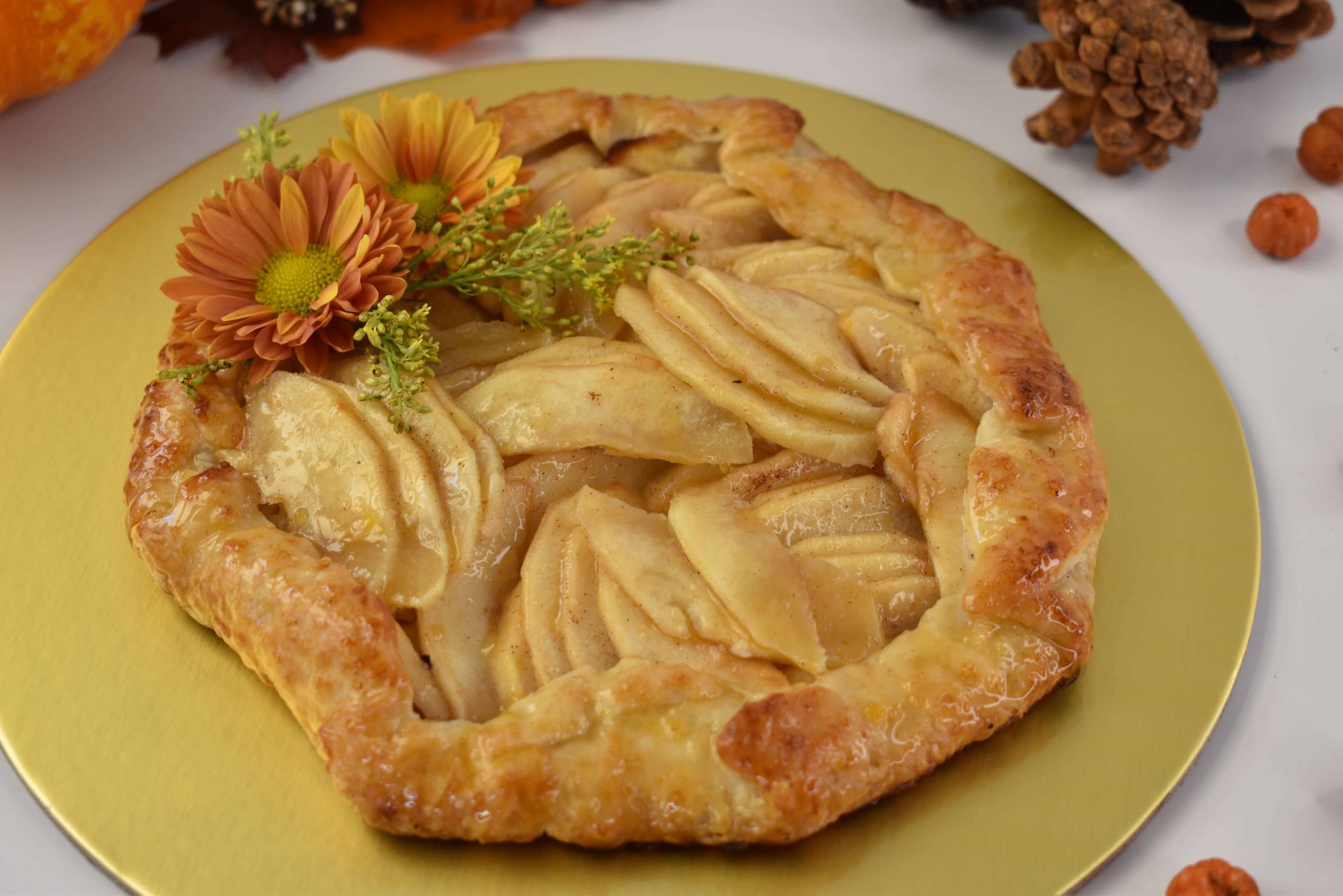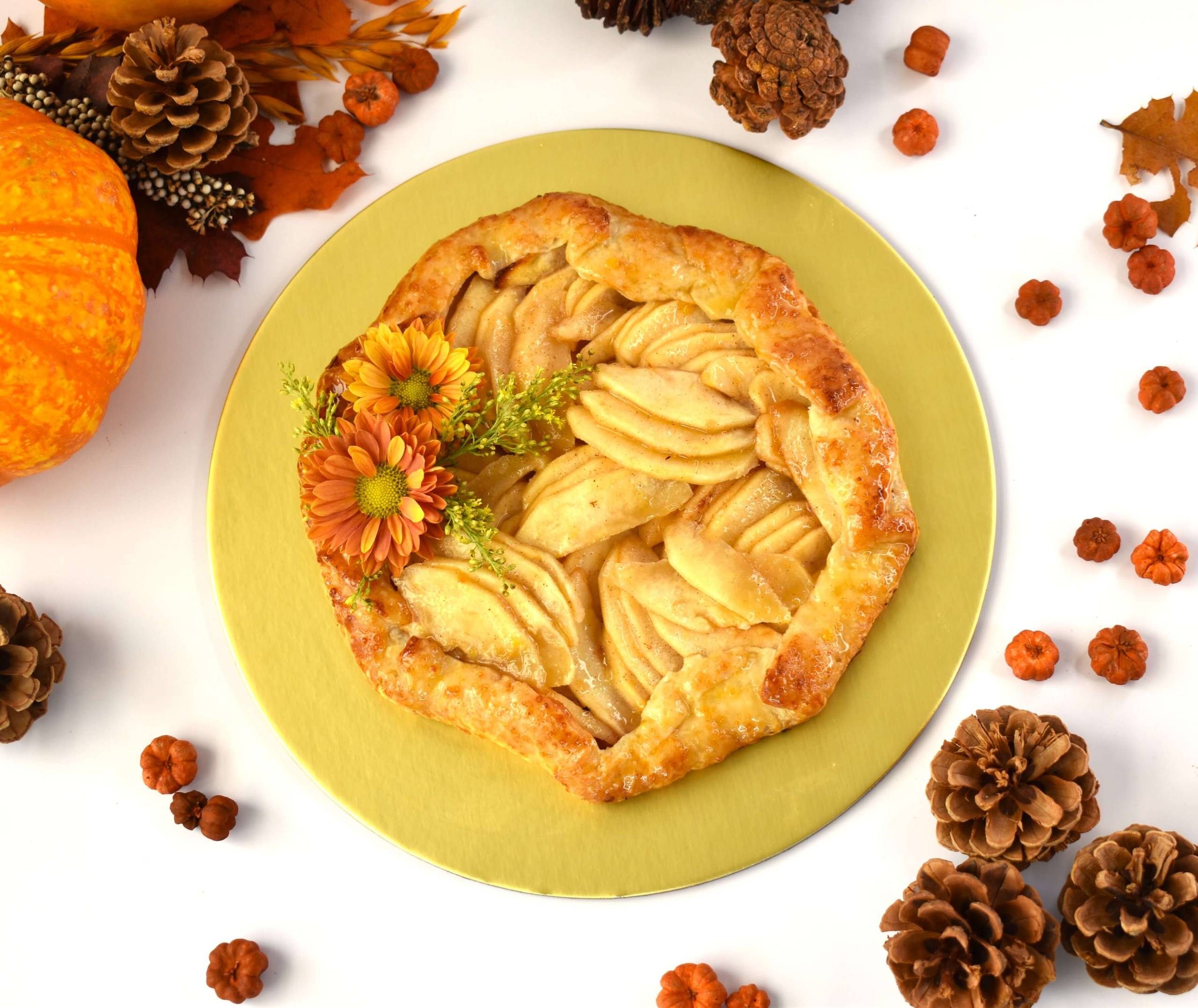 Rustic Apple Galette: a 9 1/2 inch Hand-folded and golden baked, this free-form tart features tender, apples nestled in a flaky, buttery crust, perfect for a party of 8!